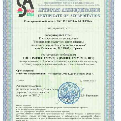 Исследования проводятся в соответствии с международным стандартом ГОСТ ISO/IEC 17025-2019. Лабораторный отдел аккредитован и внесён в Единый реестр испытательных лабораторий Евразийского экономического союза.